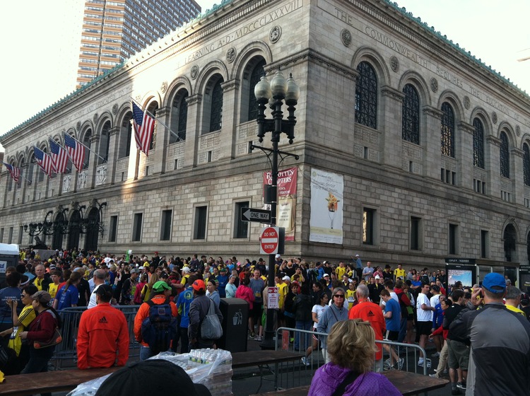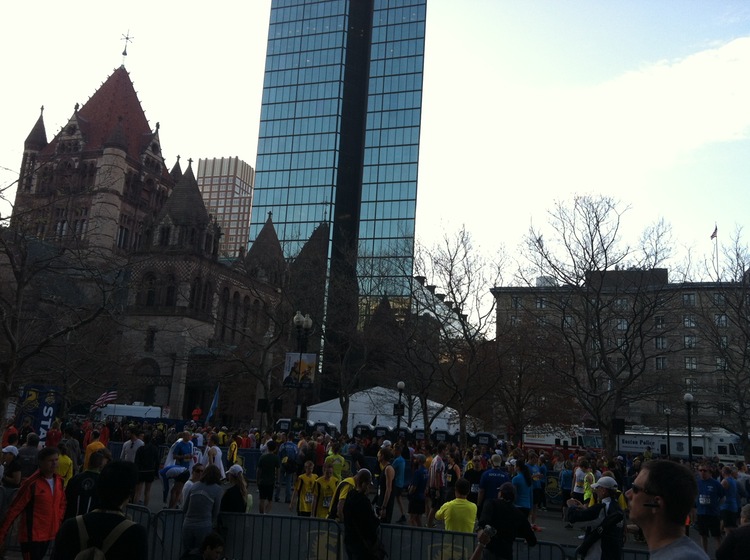 Crowds gather in the shadow of a couple of Boston landmarks (Trinity Church and the John Hancock Tower) for the B.A.A. 5K.