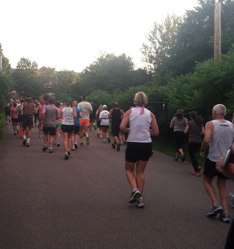 There’s customarily no public access to Long Island, so the race organizers put together an elaborate system of buses and ferries to get us to where we needed to be. We chilled while the rest of the runners arrived in installments, soaking up the pre-entertainment, the lovely view, and the warm night air. All we needed was beer and food. But no, someone thought it was a good idea to make us run three miles for it. Geez.