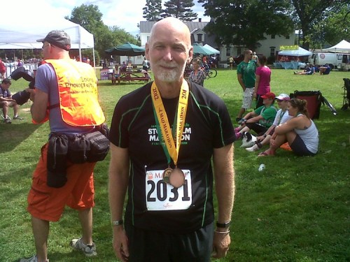 Courtney at the Vermont Mad Half Marathon in July. The second medal around his neck is an age group award. He amassed quite a number of those.