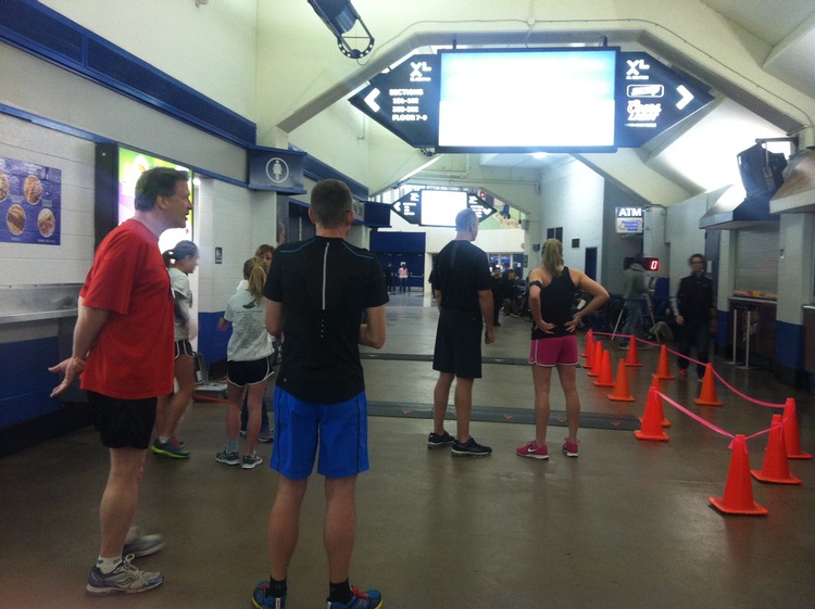 About five laps in, my face was on fire. I’m talking full-on inferno. It was crazy hot on the concourse track, and despite wishing there were beer stops each of the 15 times I ran by one of the closed concessions, it was not to be. There were 15 water stops though. I kept sneaking in a walk at the other side of the loop, away from the audience, but there was a lone medic there to witness my shame. About seven times. Oh well.